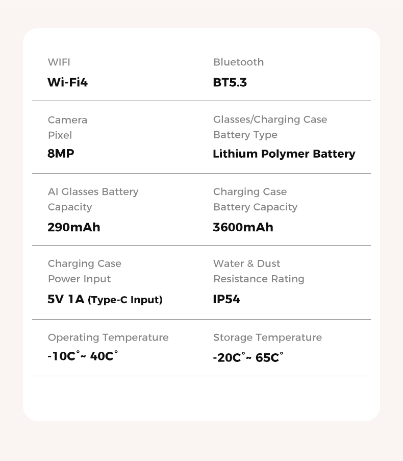 錄影、拍照、錄音、音樂播放、語音通話、OTA陞級、提示音、APP功能、內寘存儲、內接大模型、AI物體識別、AI對話、Al語音喚醒、同聲翻譯、對話翻譯、佩戴播放音樂、錄影防抖、雙麥降噪、充電倉支持給眼鏡充電和給手機充電