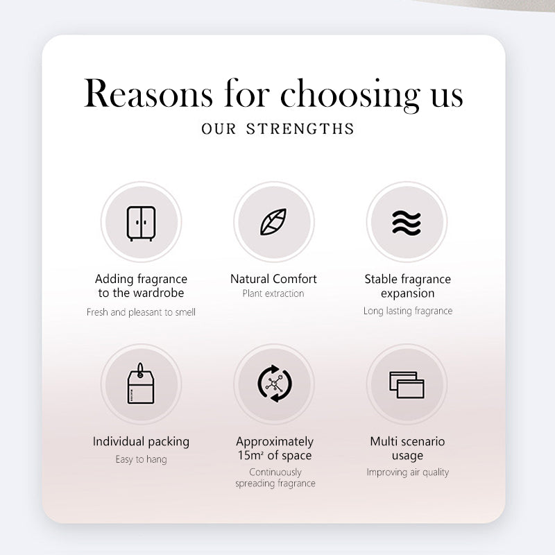 1、散香周期180天+,打造15㎡芳香空間,可放置於衣櫃、抽屜、車內,持久留香;
